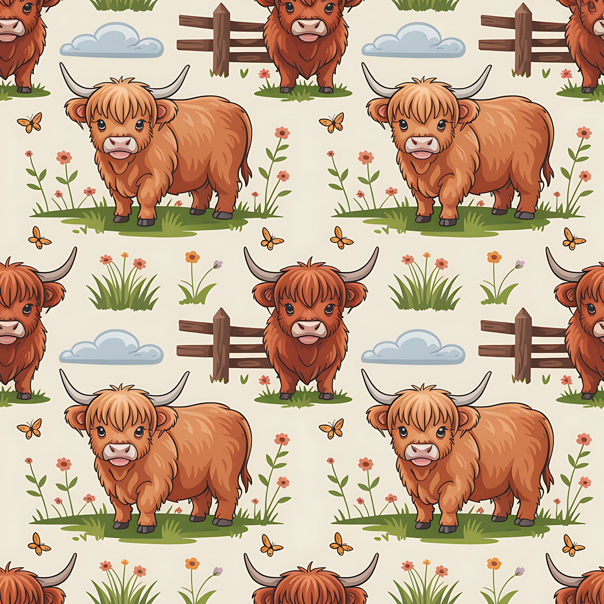 Cartoon Highland Cows Pattern 12 Quilting Cotton Fabric