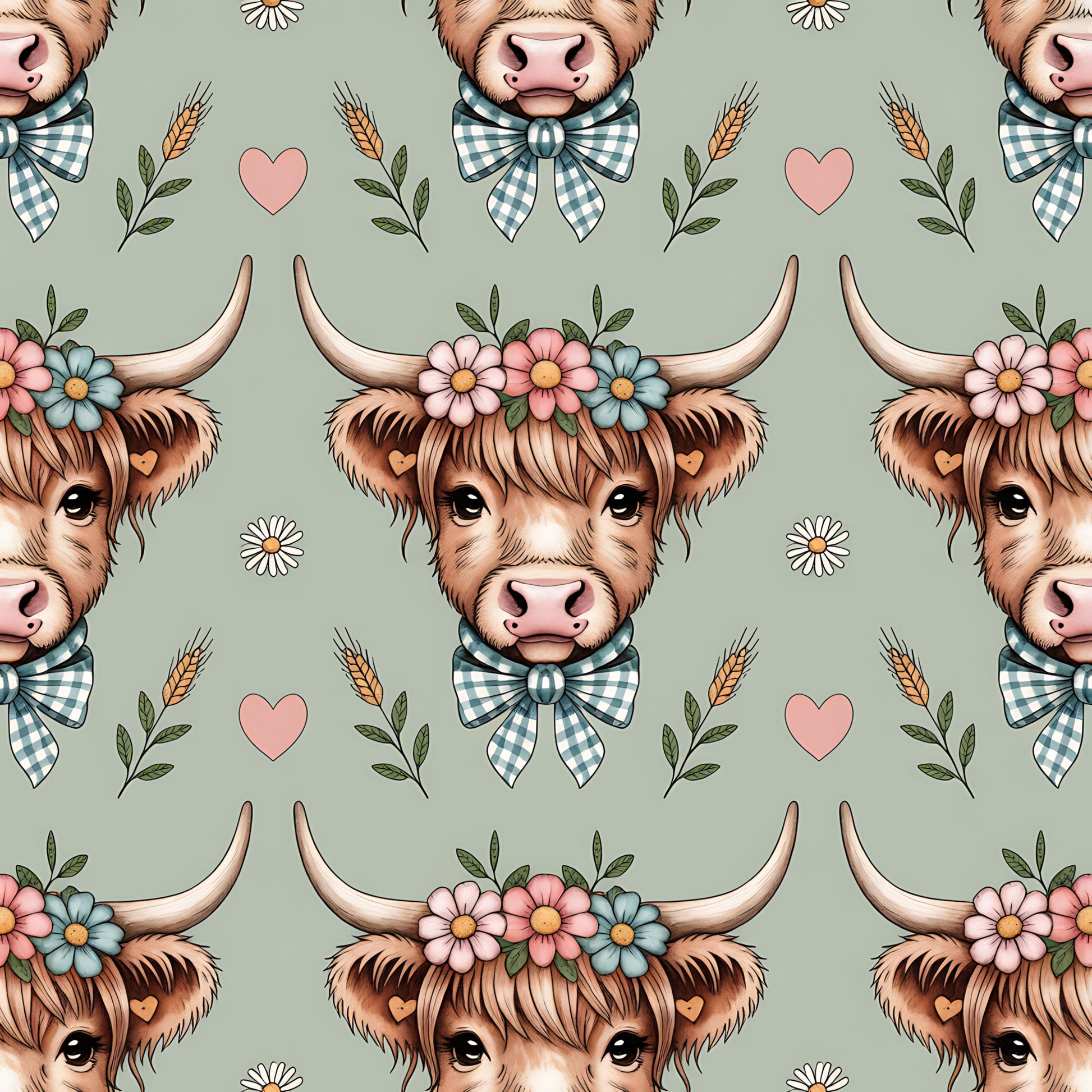 Highland Cow Heads Pattern 12 Quilting Cotton Fabric